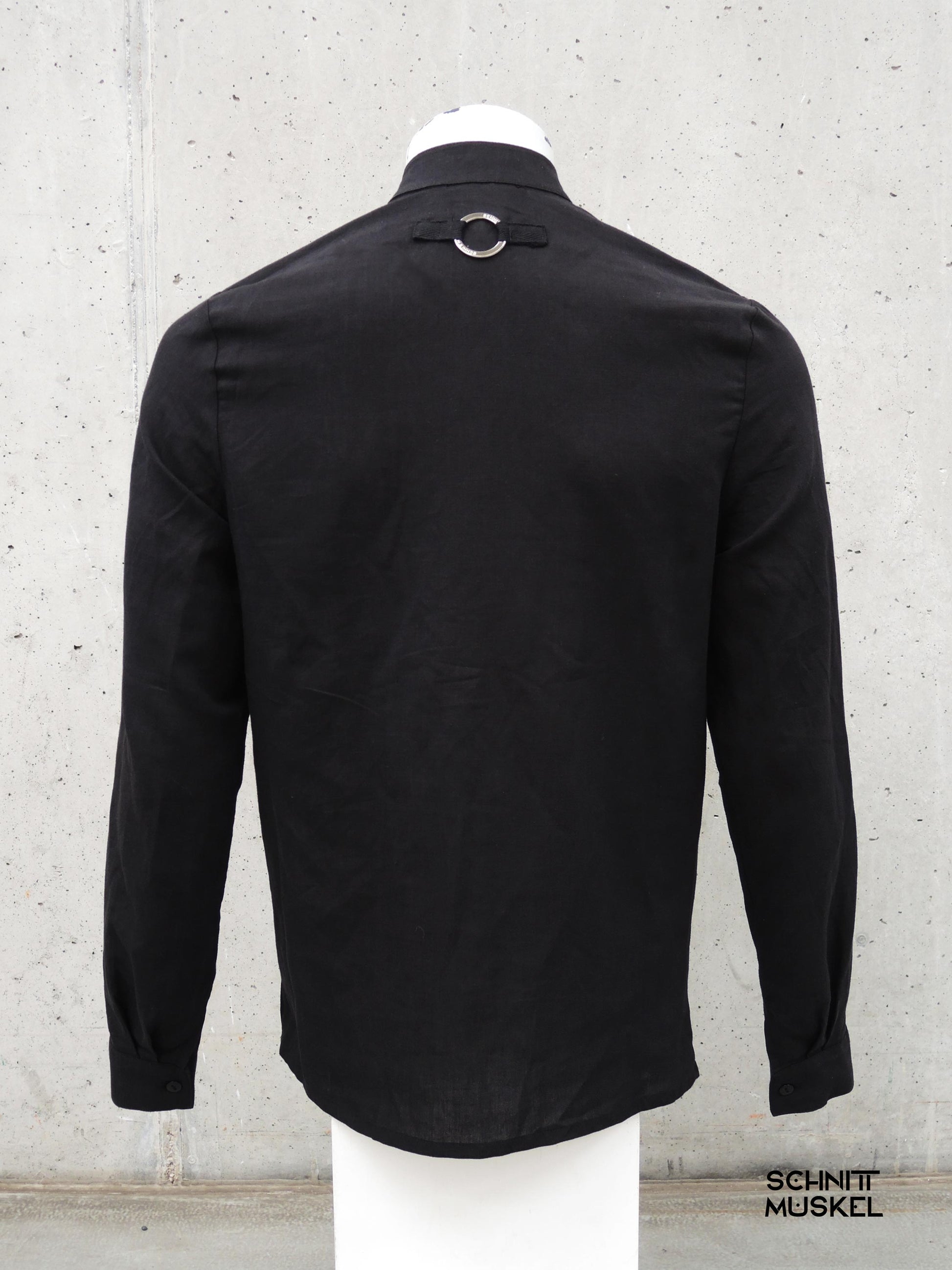 Die markante Frontschnittlinie und der stufige Saum verleihen dem Hemd Struktur und Bewegung, während der Stehkragen den Look vollendet – kompromisslos modern, mit einer Prise Rebellion. Auf der Rückseite setzt der metallene Ring-Detail einen charakteristischen Akzent, der Funktion und Form in Balance bringt.