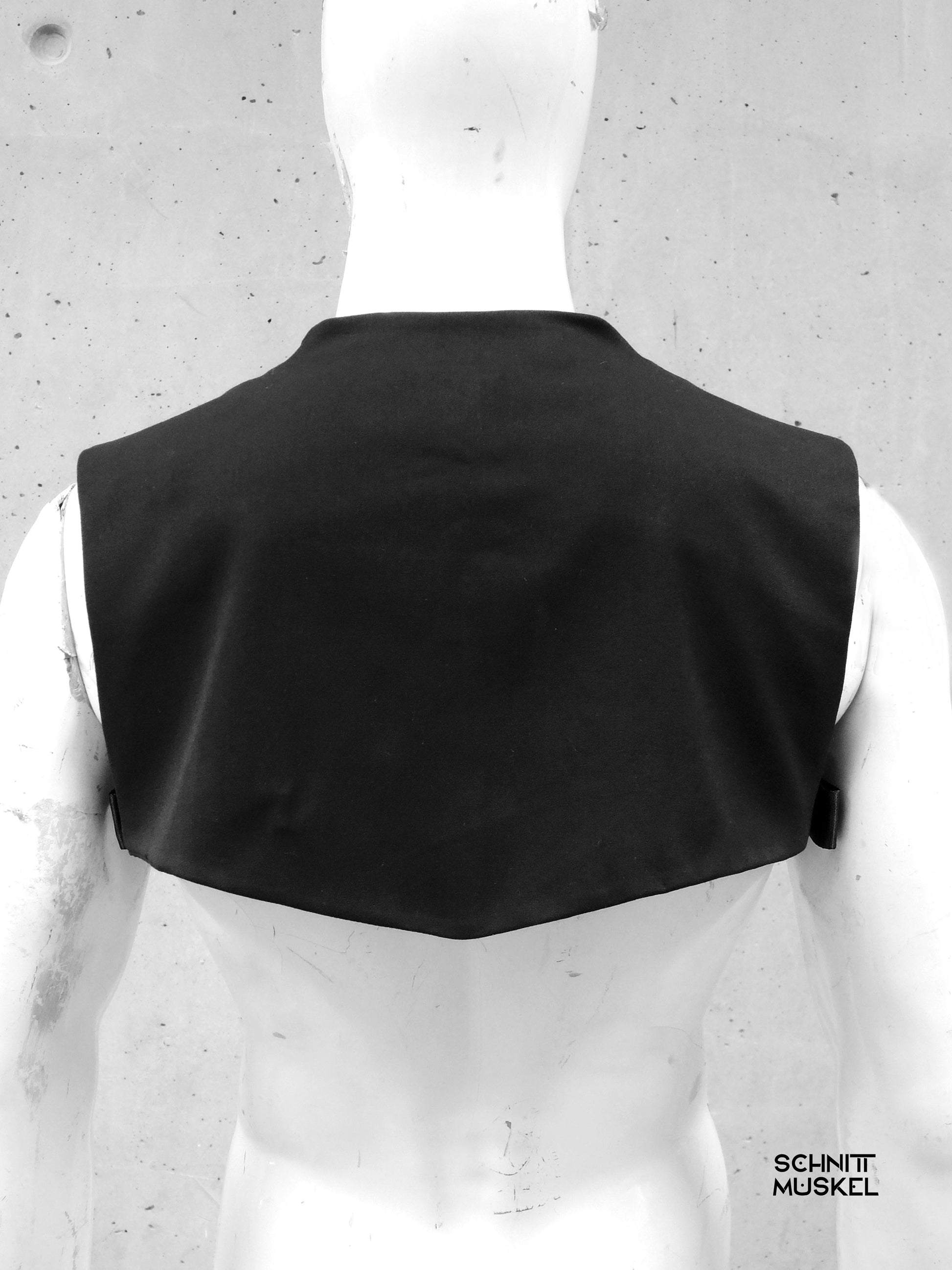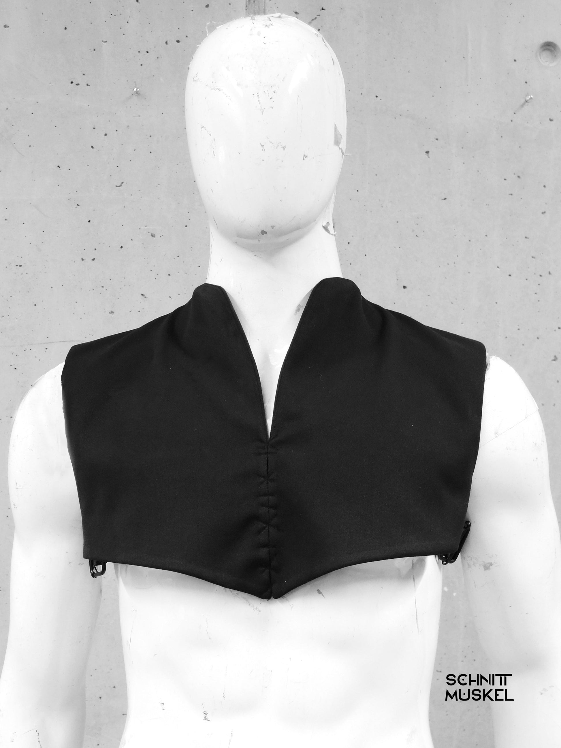 Diese kurze schwarze Weste vereint minimalistisches Design mit markanter Silhouette. Mit ihrem klaren Schnitt, der strukturierten Front und dem tiefen V-Ausschnitt mit dezentem Stehkragen, setzt sie ein starkes modisches Statement – egal, ob über einem Hemd, einem simplen Shirt oder direkt auf nackter Haut getragen.