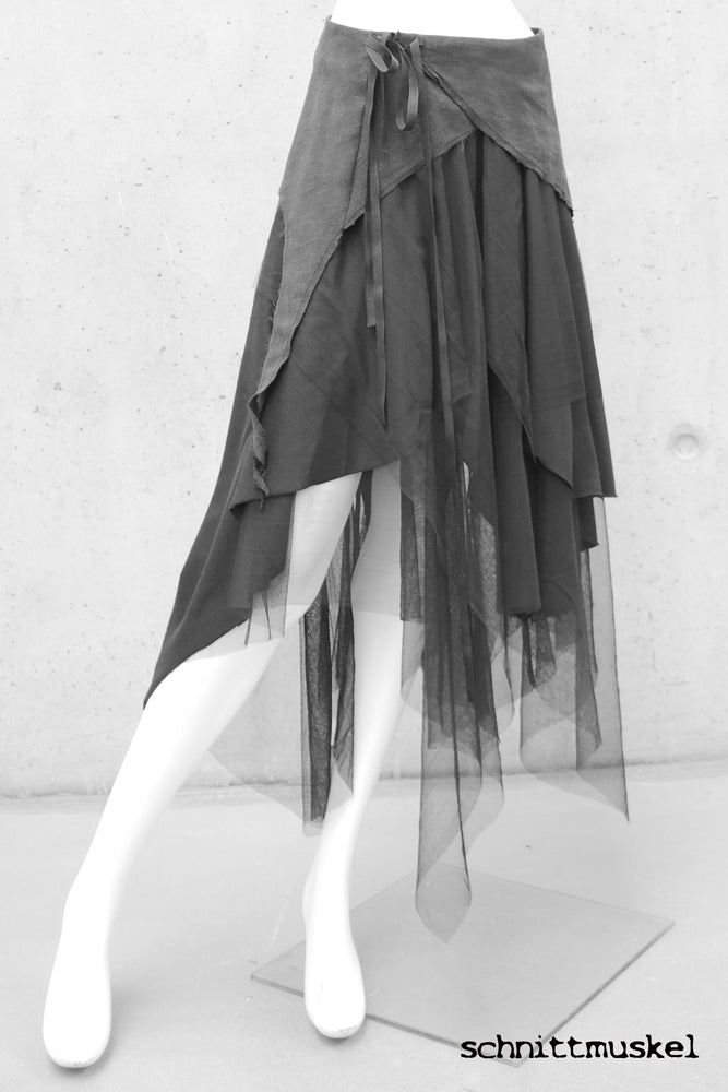 Rock "magik" besticht durch seine unterschiedlichen Stoffe. Die zipflig und asymmetrisch geschnittenen Lagen aus weichem schwarzen Tüll und einem leichten schwarzen Baumwollstoff umspielen locker leicht Deine Beine. Das ebenfalls asymmetrisch geschnittene Schösschen, aus schwarzem stone washed Leinen gibt halt am Bund und rundet das Arrangement aus unterschiedlichen Stoffen perfekt ab.